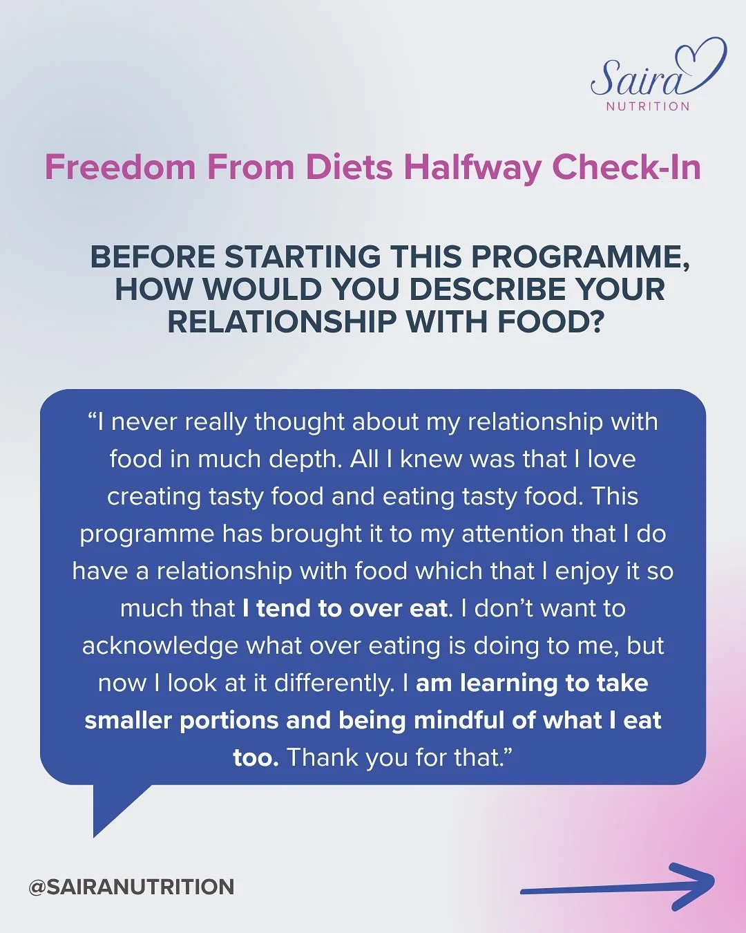 Join Saira’s 12-week online Adult Weight Management Group Programme for a holistic, non-diet, stress-free approach to weight loss. Say goodbye to points, labelling foods as bad, and pressure to share your weight with other members.