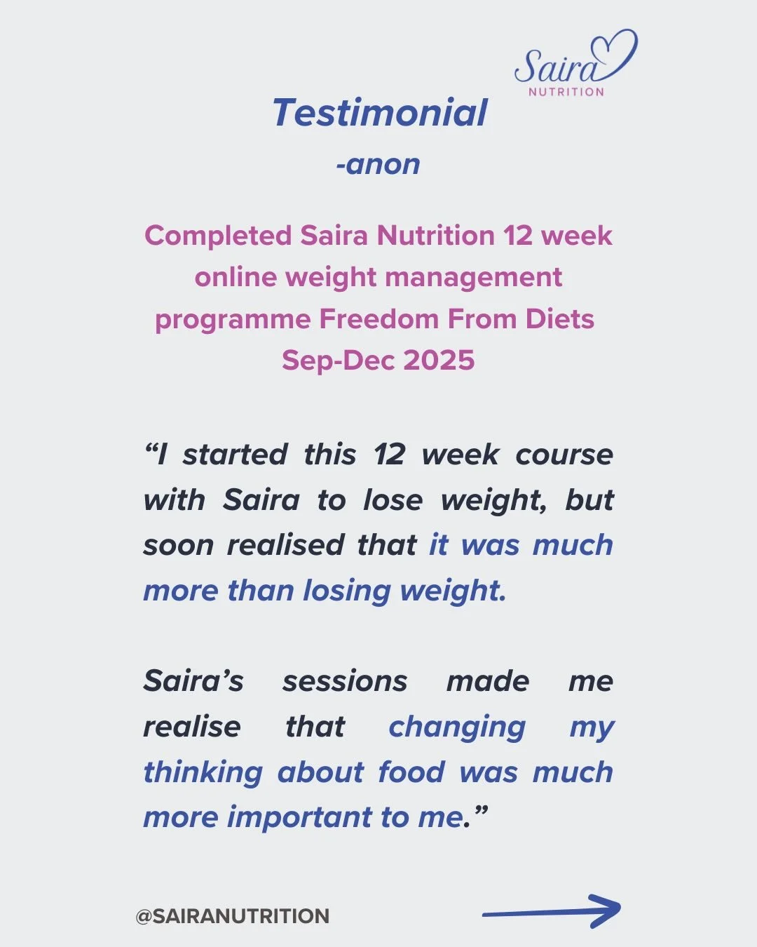 "I have been astounded by the progress I have made with very simple steps - week 5 today and I have lost 6cm off my waist! Saira's knowledge and understanding is considerable. I can see life changing steps being taken as I dispel many 'diet' myths I have picked up in the past."